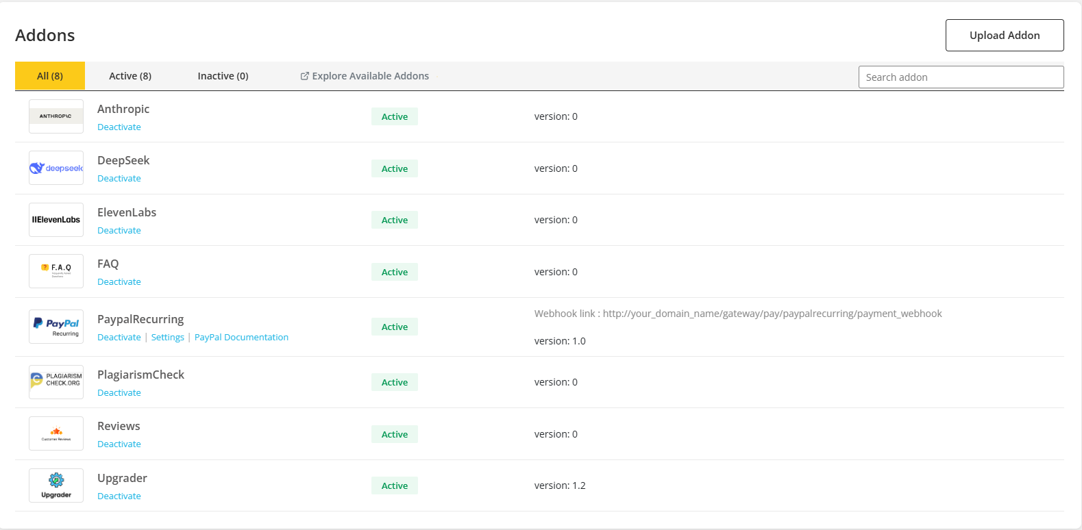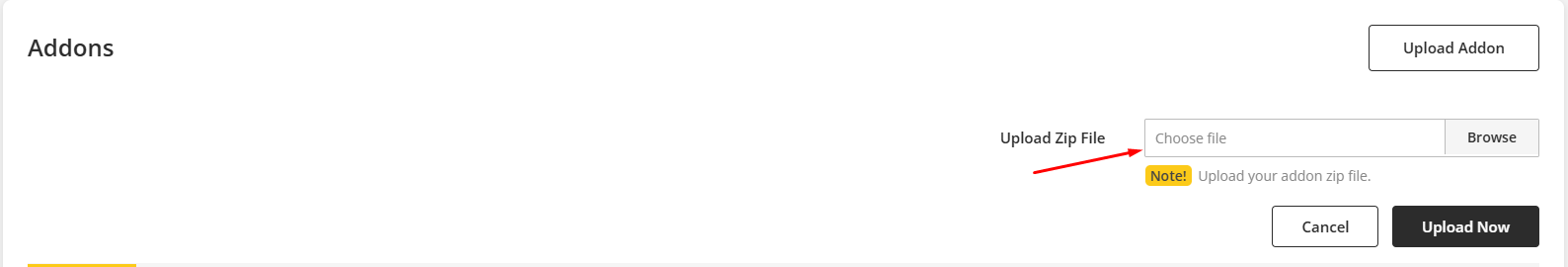 - To install the purchased addon, click Upload Addon. Now you need to upload the file on Upload Zip File field. Click on Upload Now. It will install the addon to the system and it can be seen in All list.