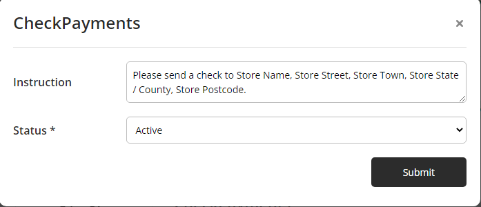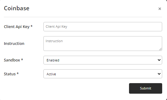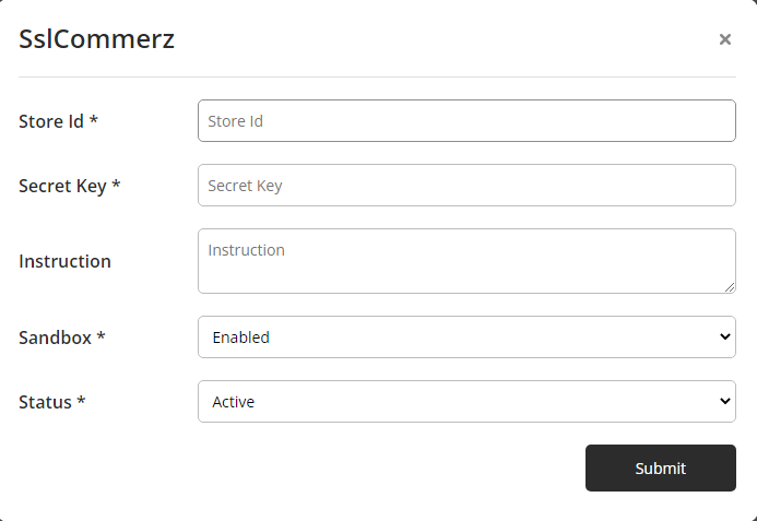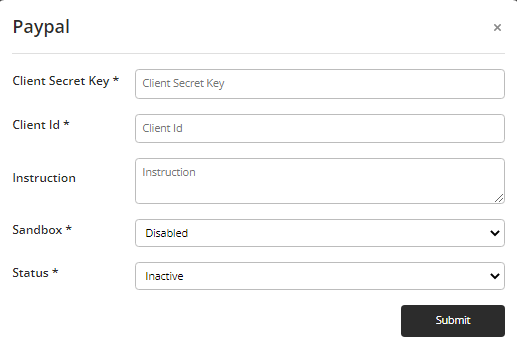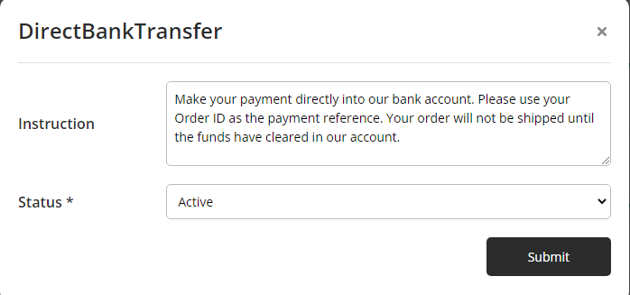active, clicking on thesubmitbutton will save the provided credentials, subsequently activating the payment method in the system.
