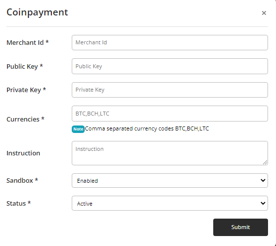 Private Key, Public Key, Merchant Id are needed to configure CoinPayments.