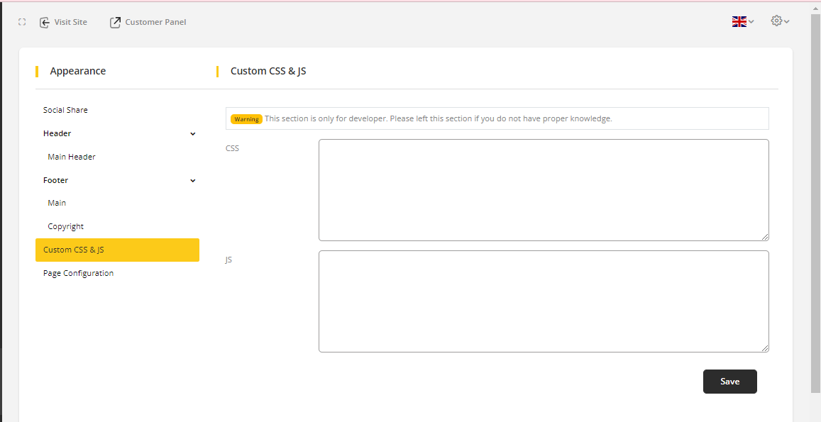 The section for Custom JS & CSS is exclusively available to developers, allowing them to utilize it for custom JavaScript and CSS purposes.