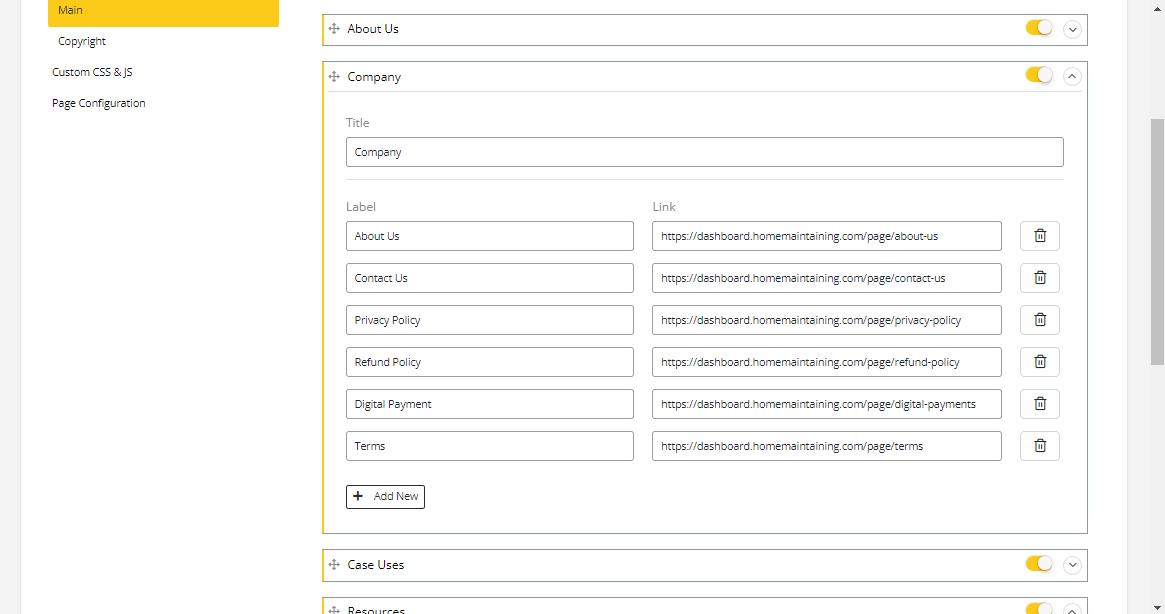To Footer, go to Website setup ⇒ Appearance ⇒ Footer ⇒ Main.