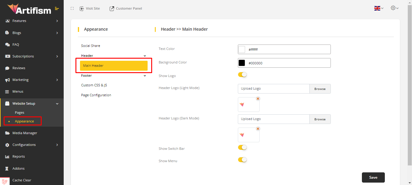 For Main header, go to Website setup ⇒ Appearance ⇒ Header ⇒ Main Header.