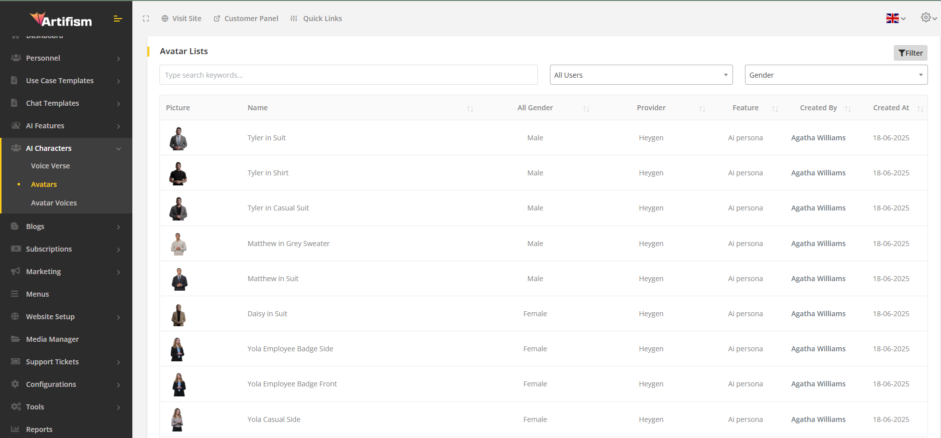 In the avatar list the admin will be able to see all the avatars that can be used to generate videos using AI Persona. This list is solely generated by the provider itself and currently the admin can not add or edit the list. However, the admin can filter the Avatar list based on keywords, creators and genders.