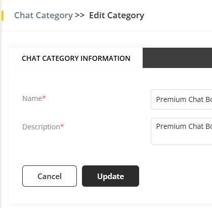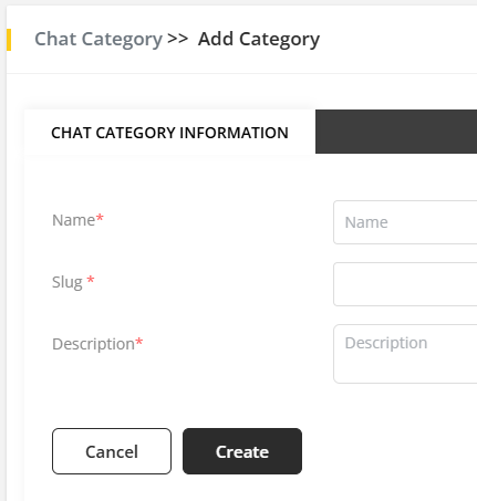 While creating a new chat category, an admin has to provide a Chat category name and description and it remains the same for chat category edit as well. The slug is auto generated and it is not displayed on the edit form.