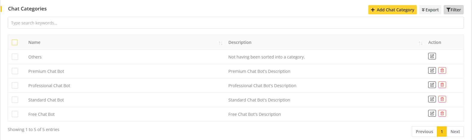 To see all the list of available chat categories, the admin has to navigate to Chat Template> Chat Categories. Here the admin can edit or delete any existing chat categories and can even add a new chat category as well. Furthermore, the admin can export the chat category list in CSV or PDF format or can even filter the chat category list using keywords.