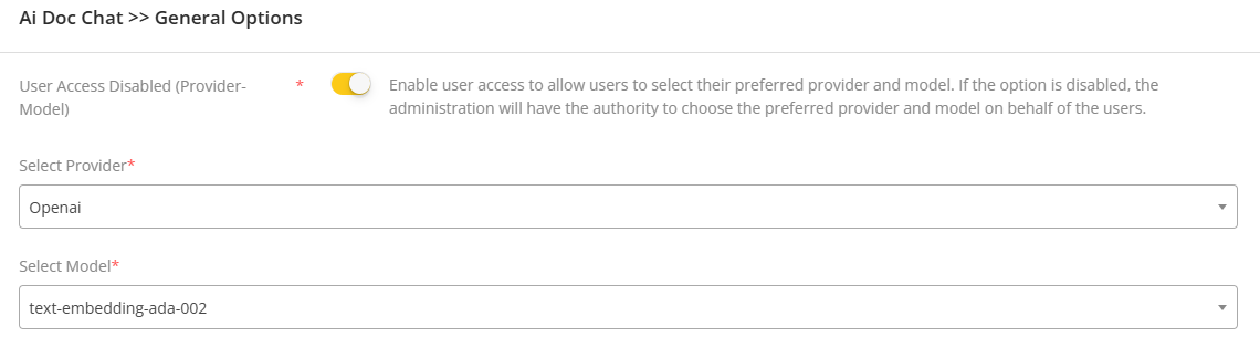 Here the admin can disable the user access to select their preferred provider and models. So, when the user access disabling option is enabled, the users will not be able to select any provider or models. If the option is disabled, then the users can choose their preferred provider and models to generate content through Document Chat and Web Chat. If the user access is disabled(user access disabling option is enabled) then the provider and model selected by the admin will work as default to generate content through Document Chat and Web Chat.