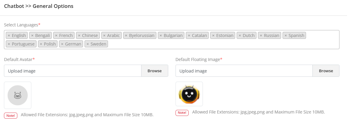 On the general option section, the admin can select all the languages that he wants the chatbot to use. The admin can even add dynamic languages to the available languages. Furthermore, the admin can select the default avatar of the chatbot. If any user does not provide any avatar for a chatbot then the default avatar will work as the avatar for that chatbot. Also the admin can upload the default floating image for the chatbot widget where the uploaded image will be displayed as default if the chatbot widget is integrated to any third-party website. The allowed extensions for default chatbot avatar and default floating image are jpg,jpeg,png and the maximum file size can be configured from Configurations>General Settings>Preferences.