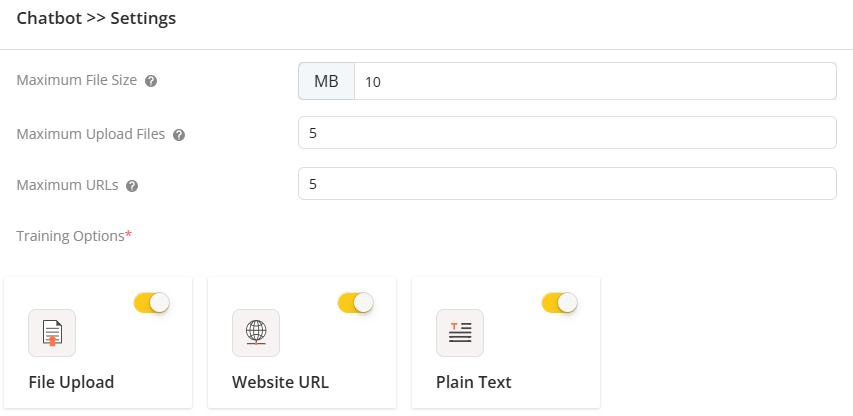 On the settings option, the admin can configure the settings related to the chatbot where the admin can select the maximum size for the uploaded documents to train the chatbot. Furthermore, the admin can select the maximum number of documents a user can upload to train the chatbot and also the maximum number of URLs that can be used to train the chatbot. Finally, the admin can enable or disable the available training options for the chatbot.