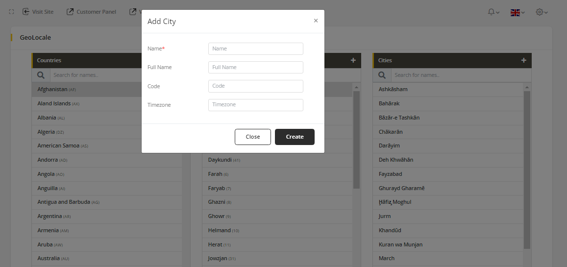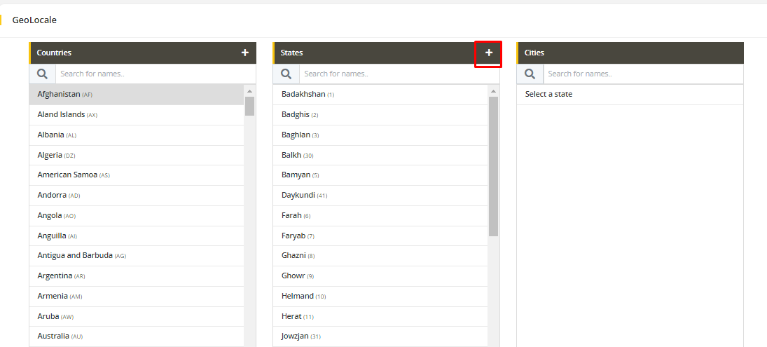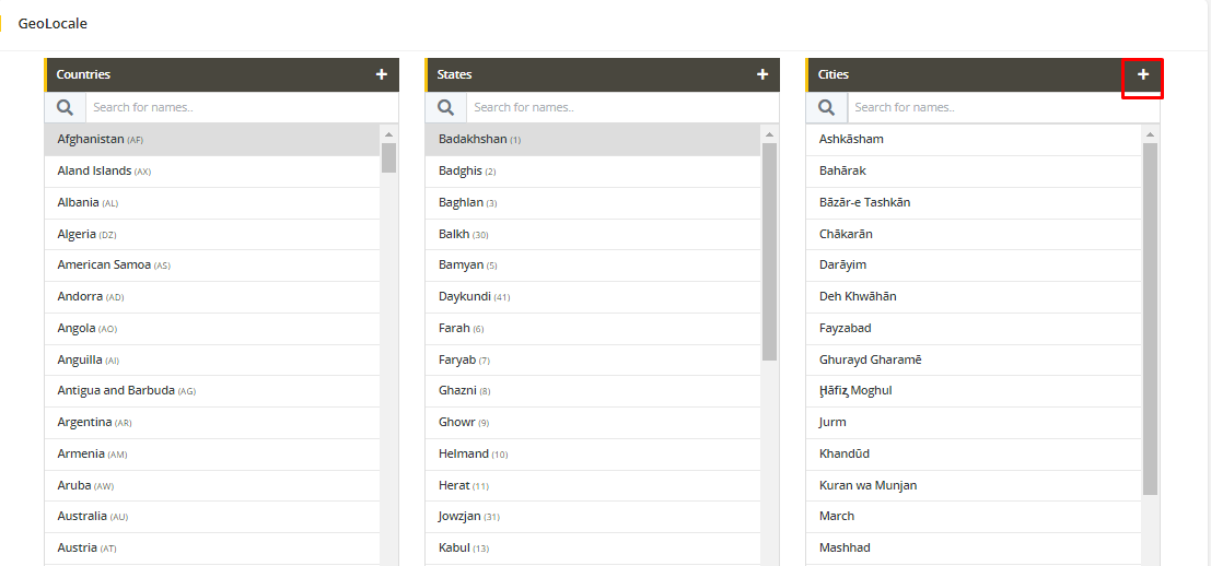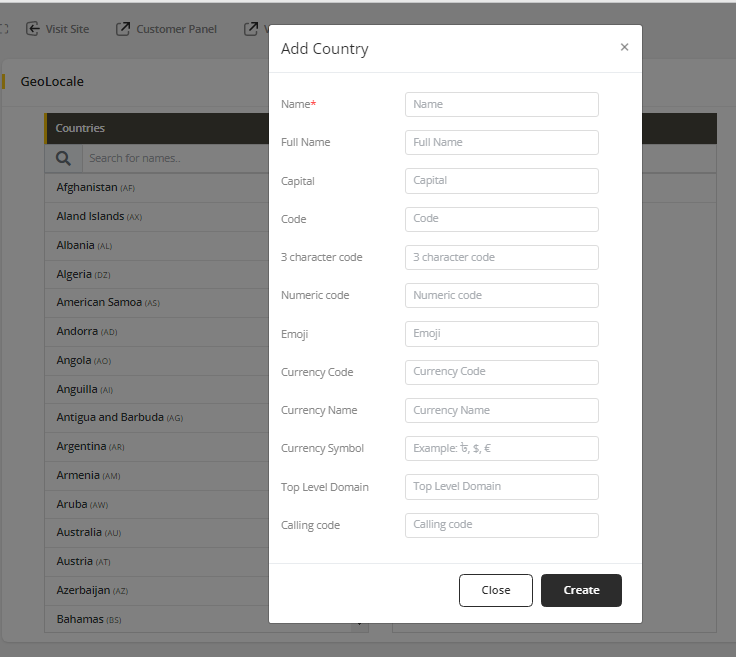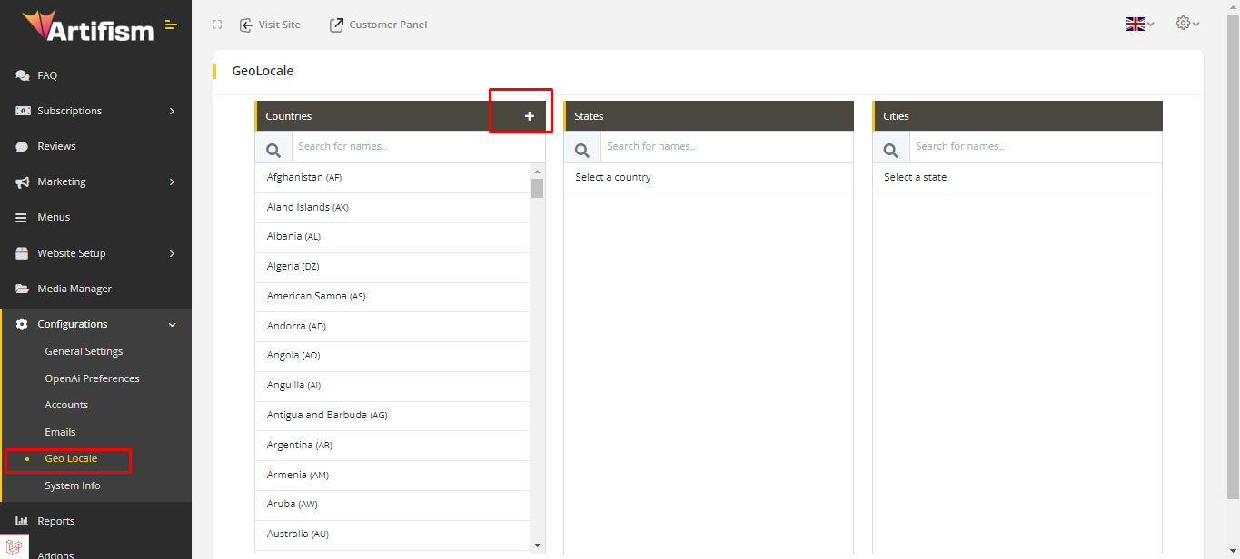 Go to Configuration ⇒ Geo Locale from the sidebar. An existing country list will appear. To add a new country, click on +(plus) on the top of the country list.
