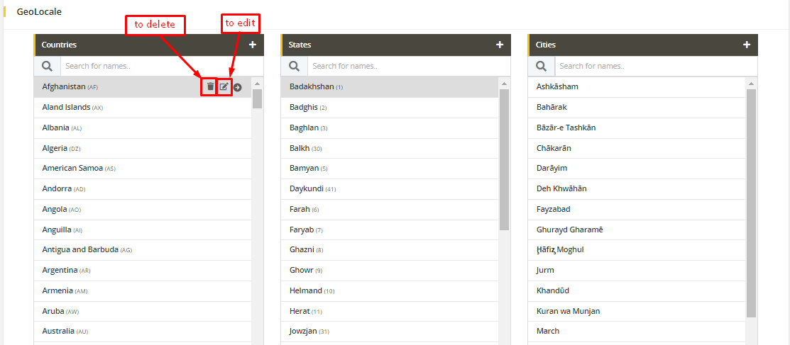 Hover on the city, there are two icons. To delete click on the Delete icon, to edit click on the edit icon.(Same as Country and State)