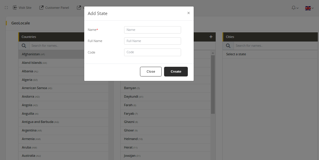 Fill up the form with valid information and submit the form to save the state under the selected country.