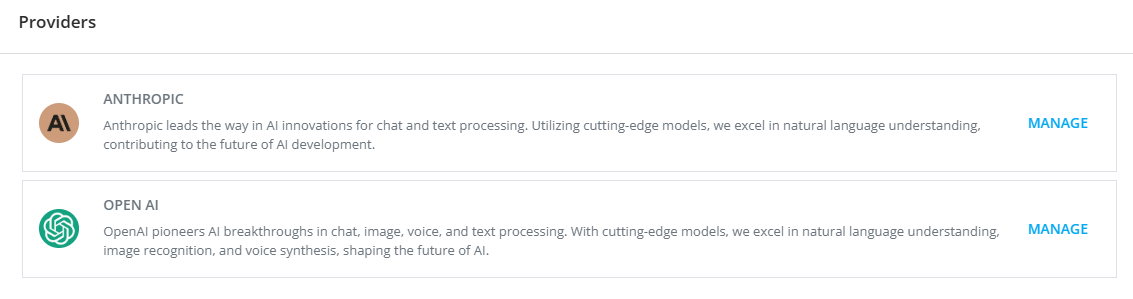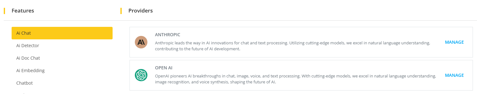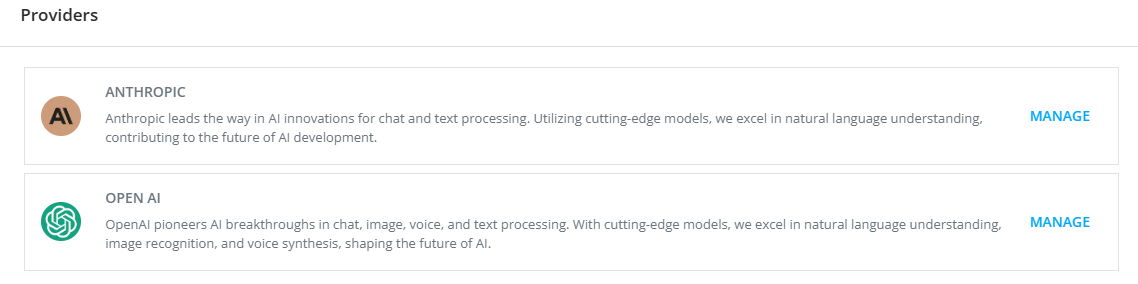 The available providers for Ai Chat features are Anthropic and OpenAi. In order to configure any of the providers, you need to click on the Manage option on any of the provider section which will navigate you to the configuration page for that particular provider.