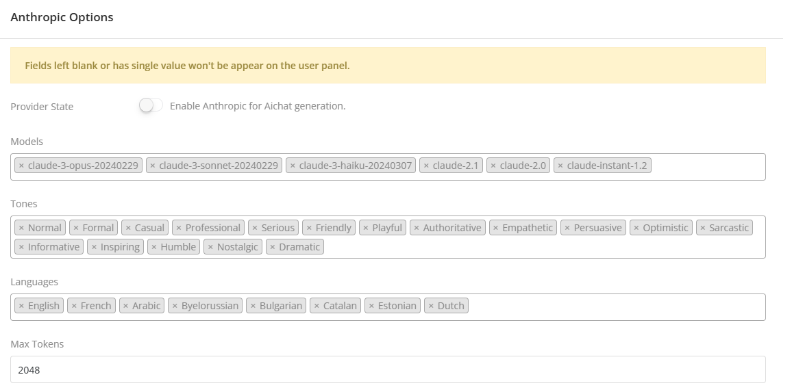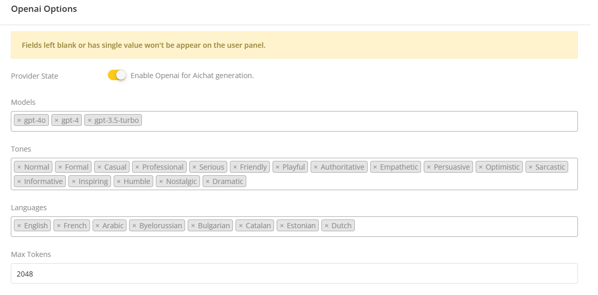 Then the user can configure the languages according to his preferences and based on the configuration tones will be appeared on the front-end while generating content through Ai Chat. It is to keep in mind that admin can add dynamic languages on the language field. He just needs to type the language name and press enter and that will add that language through which user can generate content.