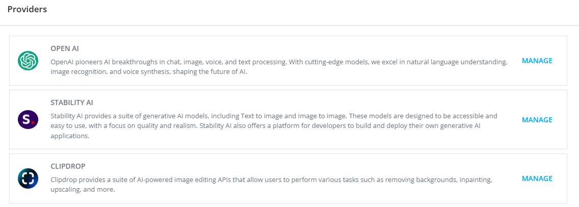 There are multiple providers through which image can be generated on the system. Currently, we have three providers in our system through which we can generate images which are OpenAi, Stability Ai and ClipDrop. If the admin wants to configure the settings for any of the providers then he can click on the Manage option on the provider section which will take the admin to the configuration page of that provider.