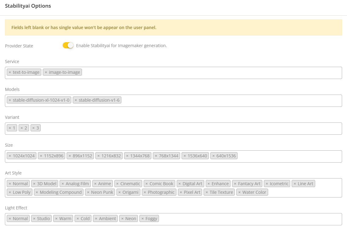 Once you go to the details of the provider configuration for Stability Ai, you can turn off the provider or enable it for the feature by simply change the Provider State switch accordingly.