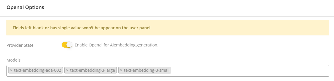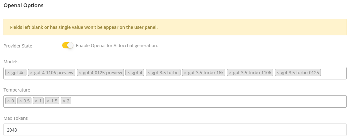 Once you go to the configuration page of any of the providers(we are considering OpenAi as an instance), you will have to enable the provider state in order to enable the provider to generate content using Ai Document/Web Chat.