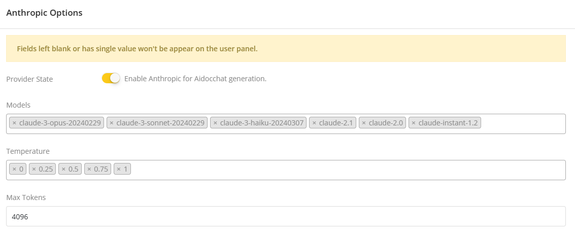 After enabling the provider, you need to configure the models as per your preferences which will be displayed in the front-end for the users to generate Doc chat content. It is to keep in mind that if no models are available or a single model is available then that field will not be displayed on the customer panel.
