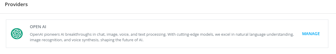We currently have a single provider available for Ai Vision Chat which is OpenAi. If the admin wants to configure the settings of the provider then he can click on the Manage option on the provider section which will take the admin to the configuration page of that provider.