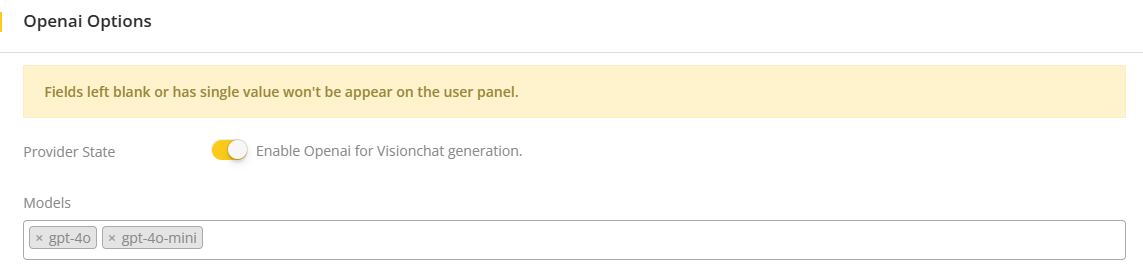 After enabling the provider, you need to configure the models as per your preferences which will be displayed in the front-end for the users to generate Vision chat content. It is to keep in mind that if no models are available or a single model is available then that field will not be displayed on the customer panel.
