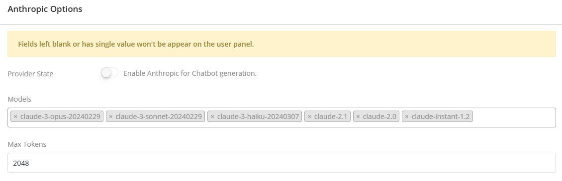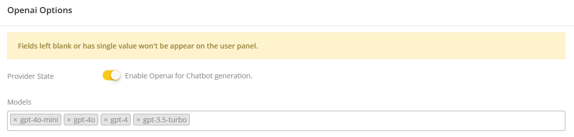 After enabling the provider, you need to configure the models as per your preferences which will be displayed in the front-end for the users to generate Chatbot content. It is to keep in mind that if no models are available or a single model is available then that field will not be displayed on the customer panel.