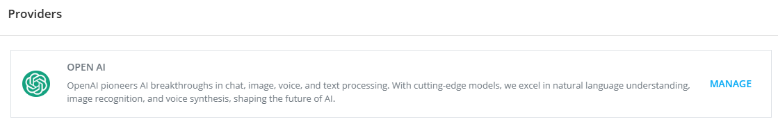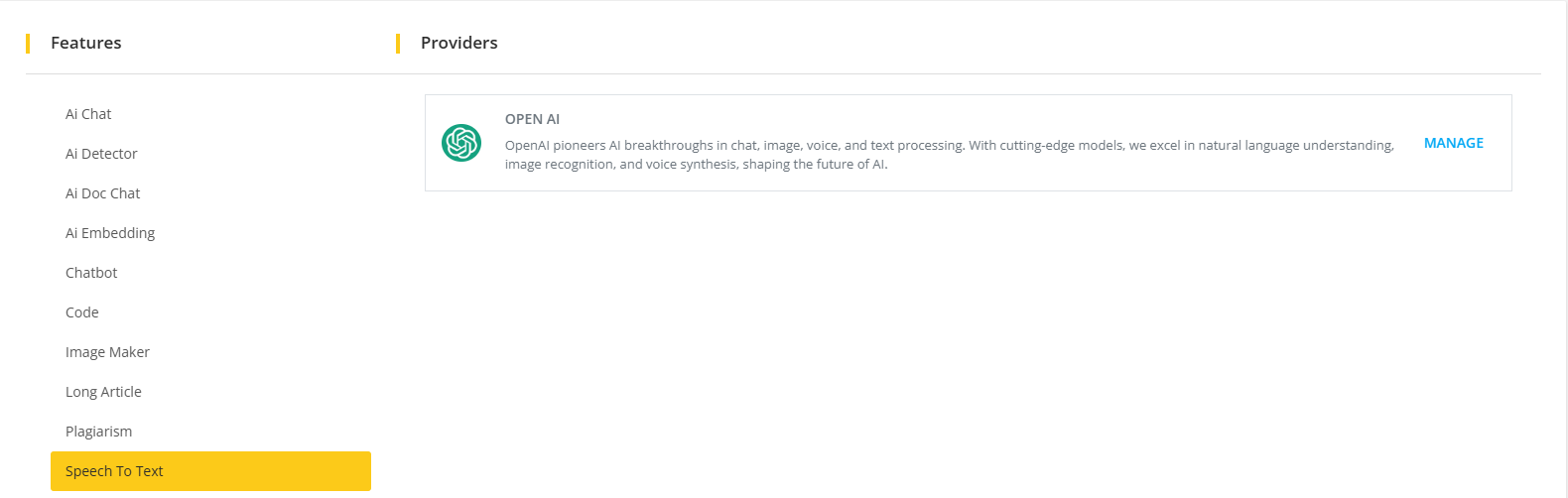 We currently have a single provider available for Speech To Text which is OpenAi. If the admin wants to configure the settings of the provider then he can click on the Manage option on the provider section which will take the admin to the configuration page of that provider.