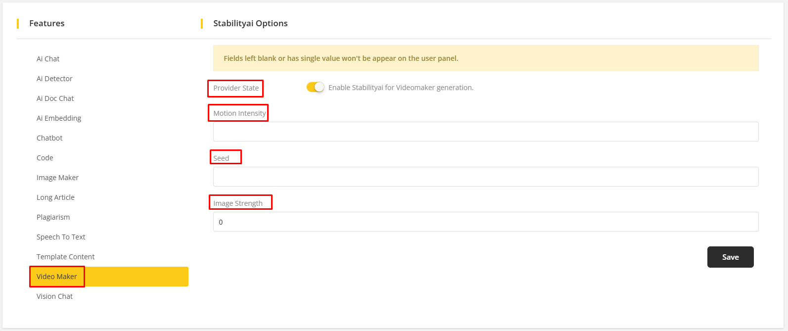 Next, you can set the default motion intensity for that feature. The value you set as the motion intensity will be appeared as default on the generation page. The value of motion intensity has to be in the range of 0~255. Please note that if you keep the default motion intensity field as empty, then the motion intensity input field will not be appeared on the front-end.