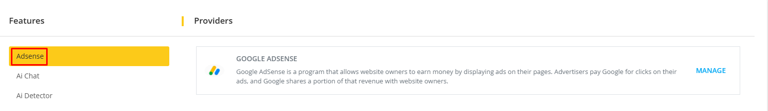 We currently have a single provider available for Adsense which is Google Adsense. If the admin wants to configure the settings of the provider then he can click on the Manage option on the provider section which will take the admin to the configuration page of that provider.
