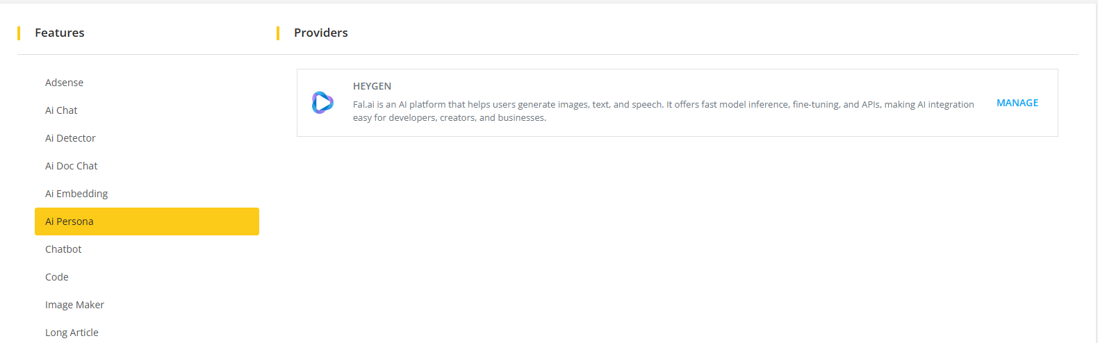 We currently have a single provider available for AI Persona which is Heygen. If the admin wants to configure the settings of the provider then he can click on the Manage option on the provider section which will take the admin to the configuration page of that provider.