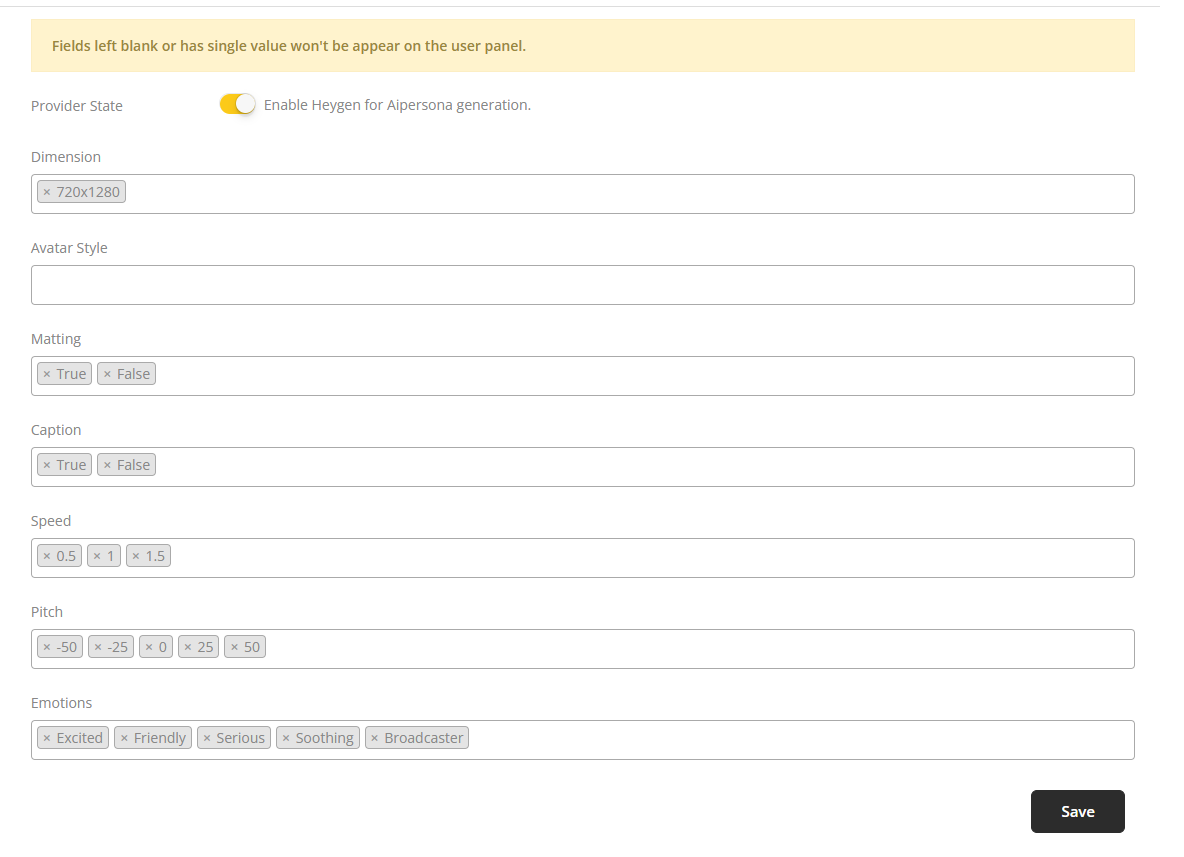 After enabling the provider, you need to configure the Dimension as per your preferences which will be displayed in the front-end for the users to generate AI Persona content. It is to keep in mind that if no dimemsions are available or a single dimension is available then that field will not be displayed on the customer panel.