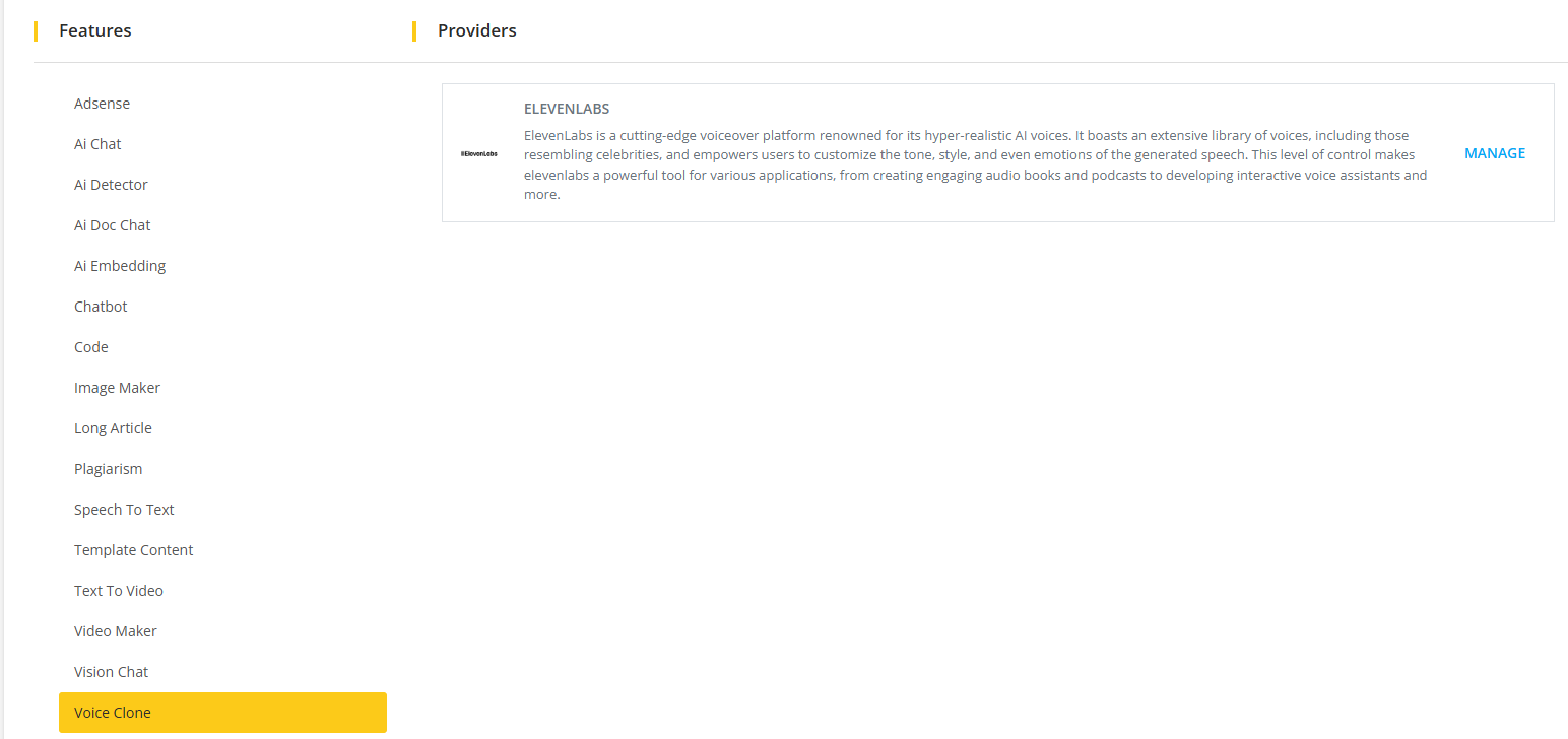 We currently have a single provider available for Voice Clone which is ElevenLabs. If the admin wants to configure the settings of the provider then he can click on the Manage option on the provider section which will take the admin to the configuration page of that provider.