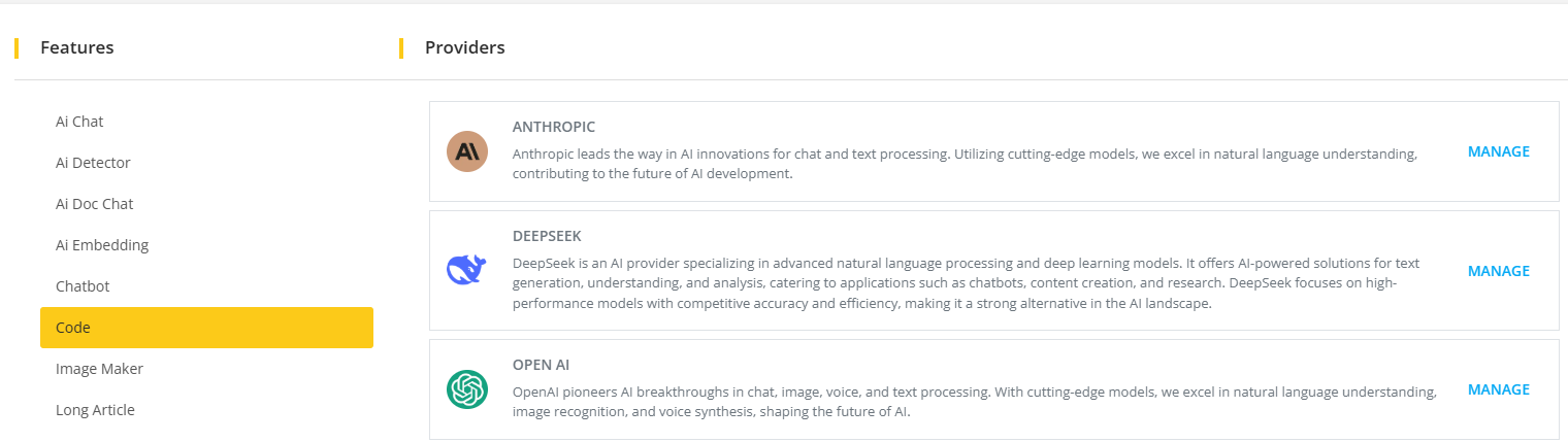 We currently have three provider available for code which are OpenAI, Anthropic and Deepseek. If the admin wants to configure the settings for any of the providers then he can click on the Manage option on the provider section which will take the admin to the configuration page of that provider.