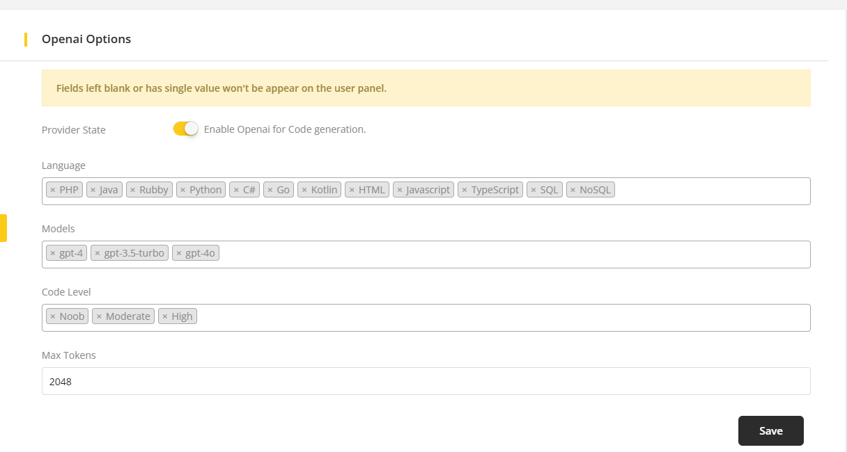 After enabling the provider, you need to configure the languages as per your preferences which will be displayed in the front-end for the users to generate Code. It is to keep in mind that if no models are available or a single model is available then that field will not be displayed on the customer panel.