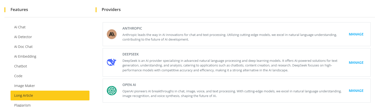 We currently have three provider available for long article which are OpenAI, Anthropic and Deepseek. If the admin wants to configure the settings for any of the providers then he can click on the Manage option on the provider section which will take the admin to the configuration page of that provider.