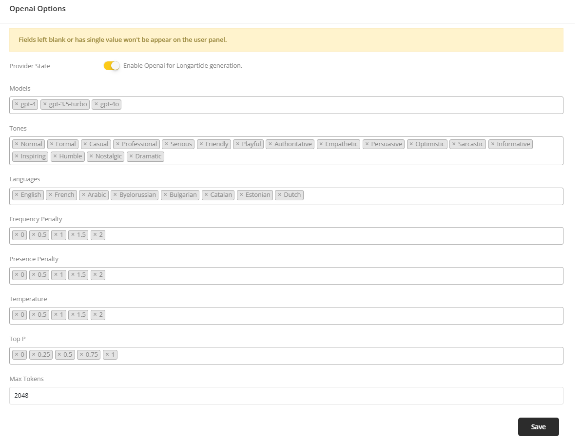 Subsequently, you need to configure the tones as per your preferences which will be displayed in the front-end for the users to generate Long Article. It is to keep in mind that if no tones are available or a single tones is available then that field will not be displayed on the customer panel.