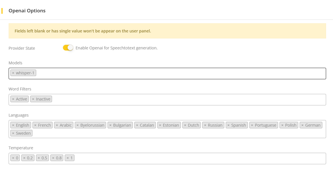 After enabling the provider, you need to configure the models as per your preferences which will be displayed in the front-end for the users to generate Speech To Text content. It is to keep in mind that if no models are available or a single model is available then that field will not be displayed on the customer panel.