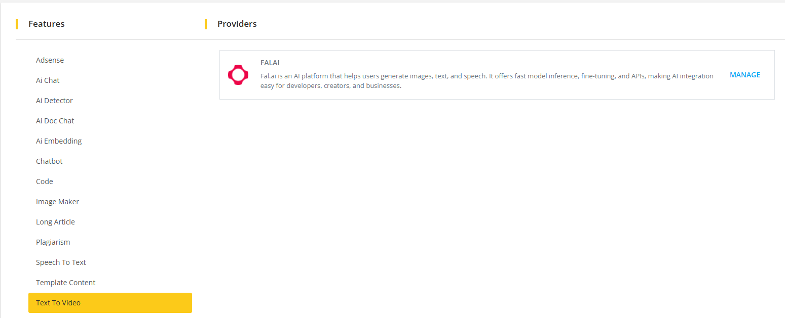 We currently have a single provider available for Text to Video which is Fal Ai. If the admin wants to configure the settings of the provider then he can click on the Manage option on the provider section which will take the admin to the configuration page of that provider.