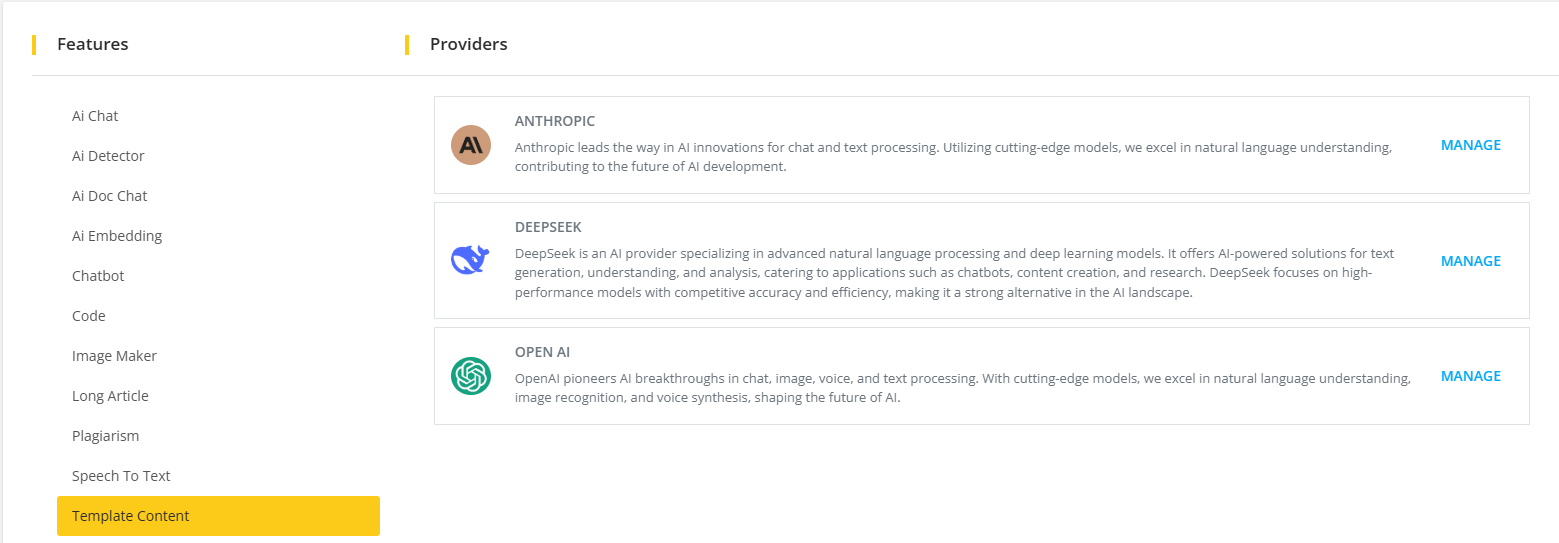 We currently have three provider available for template content which are OpenAI, Anthropic and Deepseek. If the admin wants to configure the settings for any of the providers then he can click on the Manage option on the provider section which will take the admin to the configuration page of that provider.