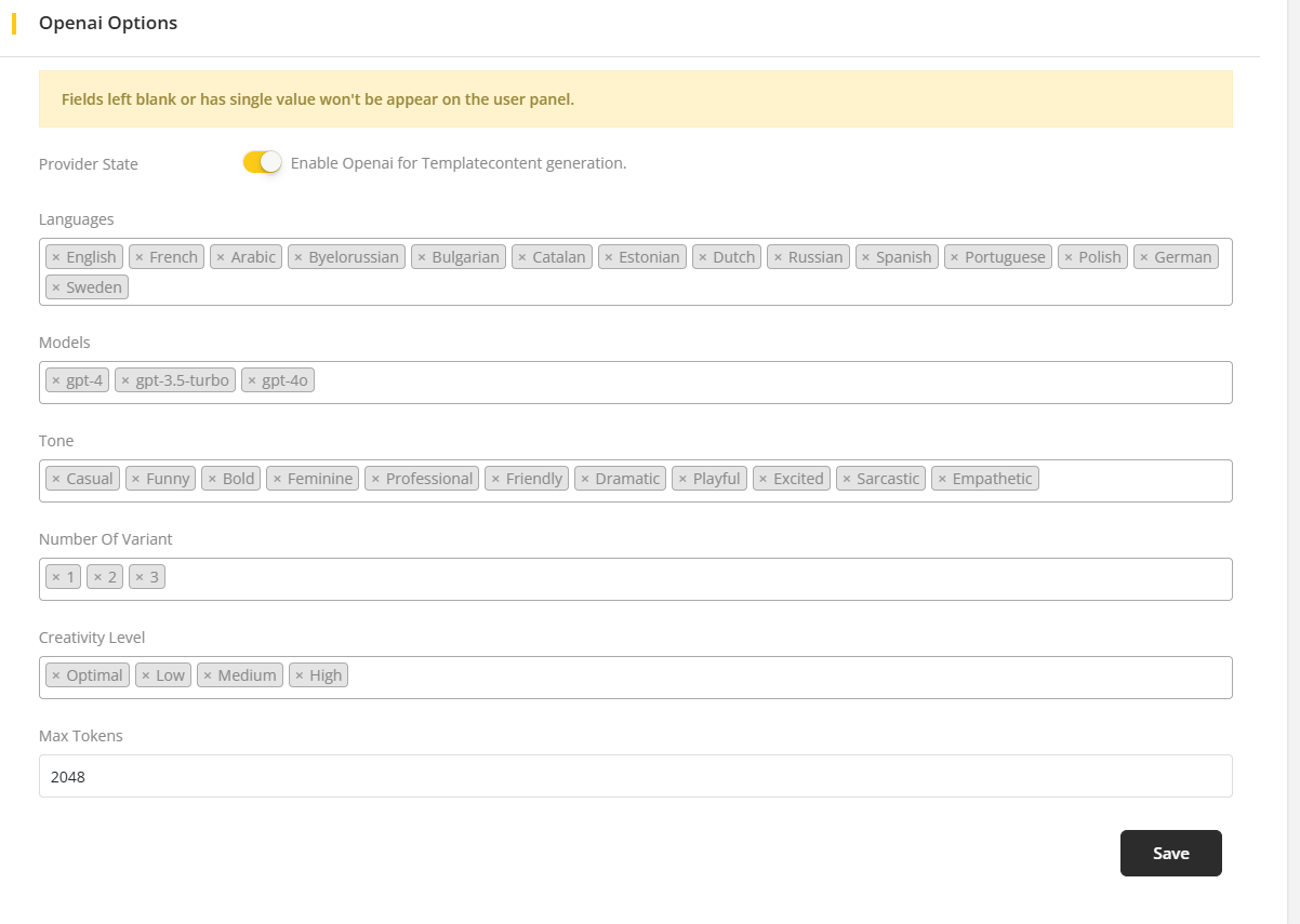 After enabling the provider, you need to configure the languages as per your preferences which will be displayed in the front-end for the users to generate Template content. It is to keep in mind that if no models are available or a single model is available then that field will not be displayed on the customer panel.