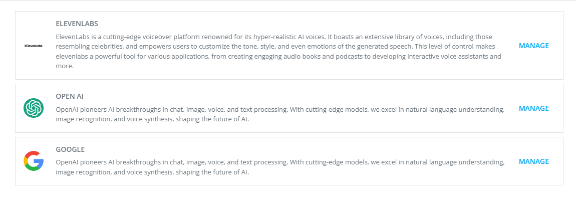 We currently have three provider available for voiceover which are OpenAI, Google and ElevensLabs. If the admin wants to configure the settings for any of the providers then he can click on the Manage option on the provider section which will take the admin to the configuration page of that provider.
