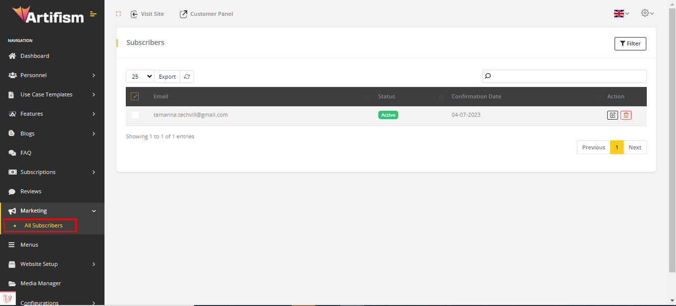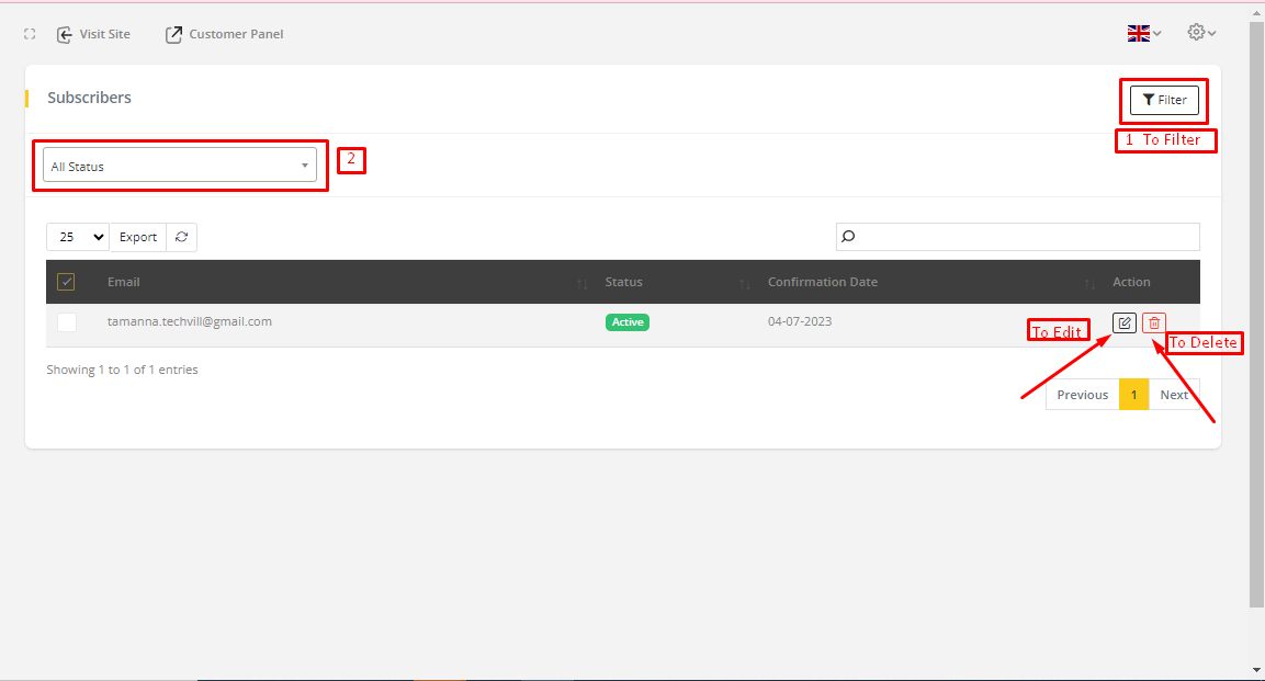 You can edit & delete the subscriber. Clicking on the Filter icon, status filter will appear by which subscribers can search by status.