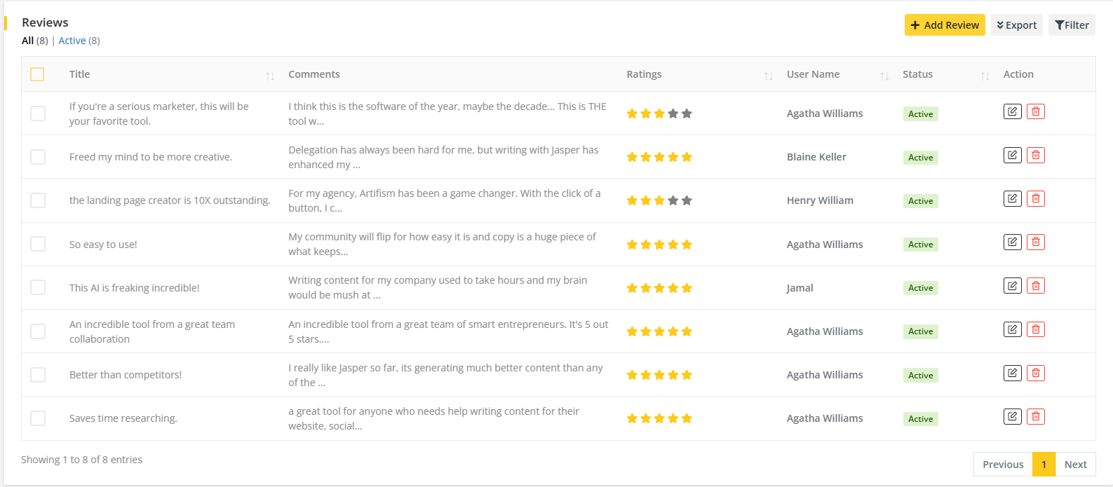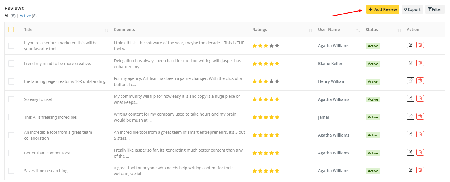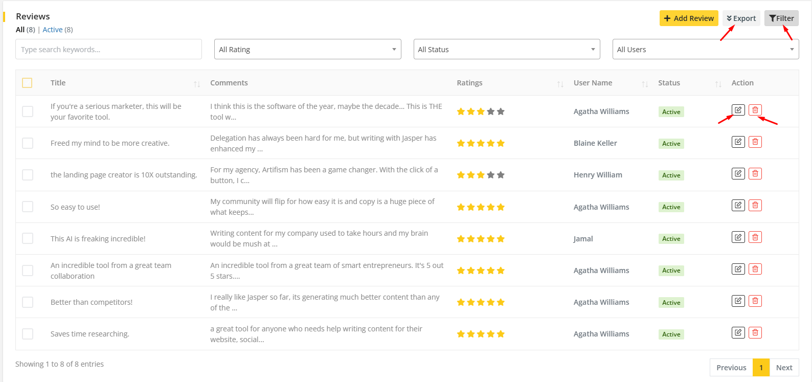 Admin can filter the Review list using keywords, ratings, status and users. Furthermore the admin can edit or delete any existing Review from the list. Also the admin can export the Review list in CSV and PDF format.