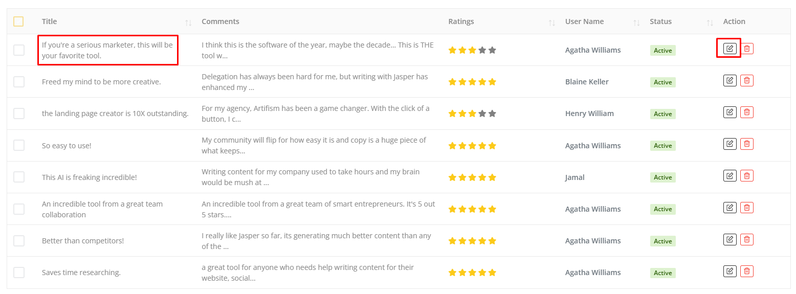 Go to Reviews From the sidebar. An existing review list will appear. Select a review from the review list, and click on the Edit icon.