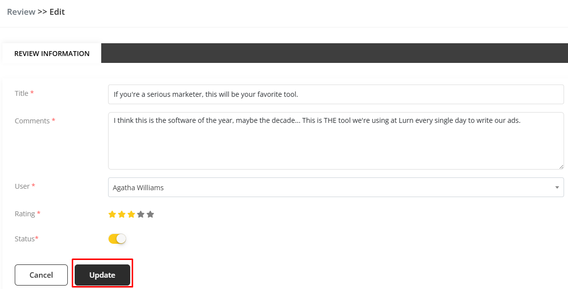 After clicking on the Edit icon, selected review details will show on the page. Change the information according to your wish and click on the Update button.
