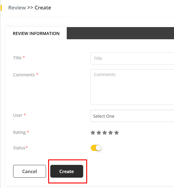 After clicking on the Add Review button, a form will show on the page. Fill the form with valid information. And click on the Create button.