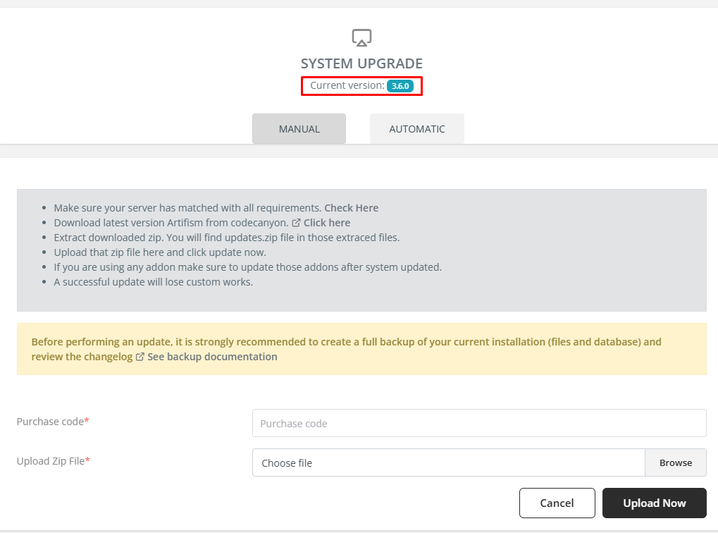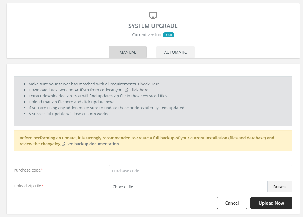 Step 3: In the System Update section, enter your Artifism purchase code in the input box provided. Next, click on the Browse button to select the update_version_x.x.x_to_x.x.x.zip file that you downloaded in Step 1. Once selected, click on the Upload button to start the upload process.