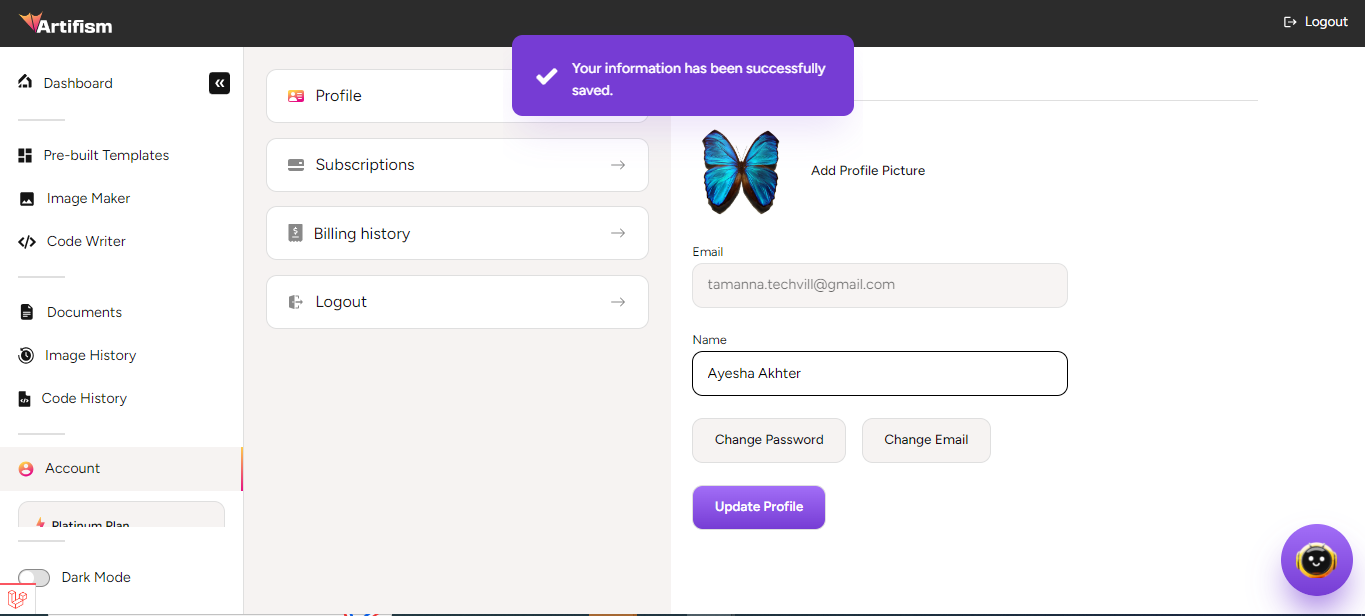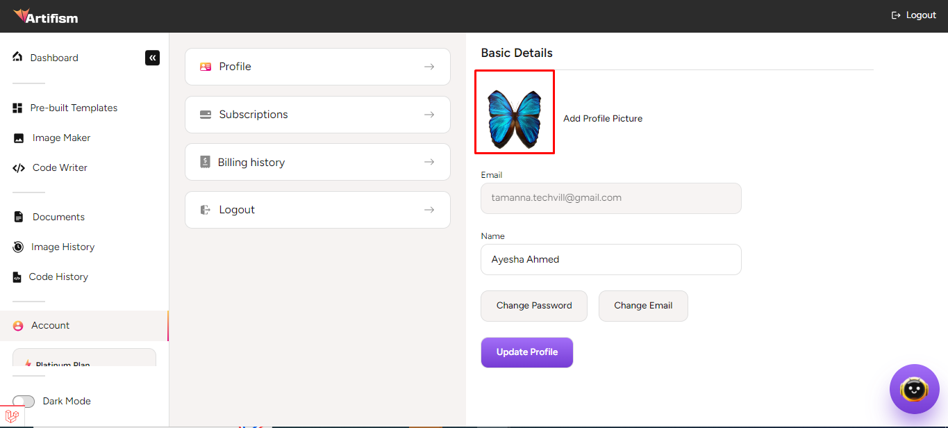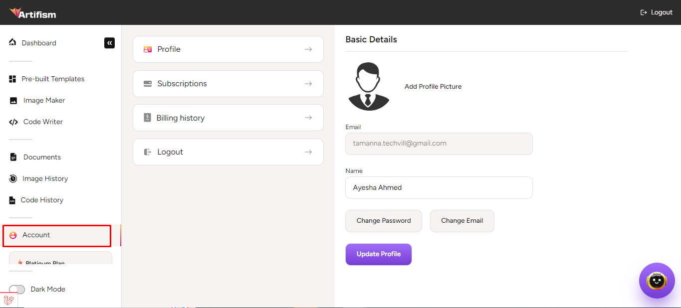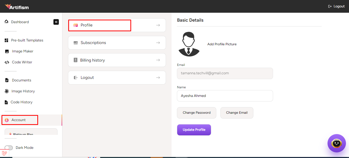 To go to the profile, go to Account ⇒ Profile from the sidebar. The detailed profile info is shown here, users can add profile picture, change password, email & name.
