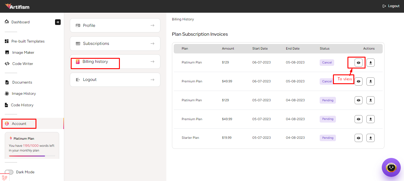 To view billing history, click on the Account ⇒ Billing history from the sidebar. An existing list of bills invoices will appear.
