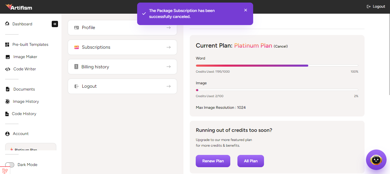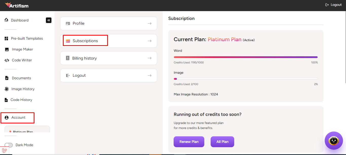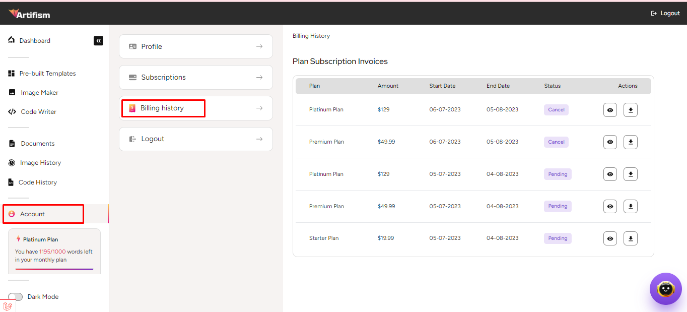 To view the account, click on the Account from the sidebar. There are four sections - profile, subscriptions, billing history & logout.
