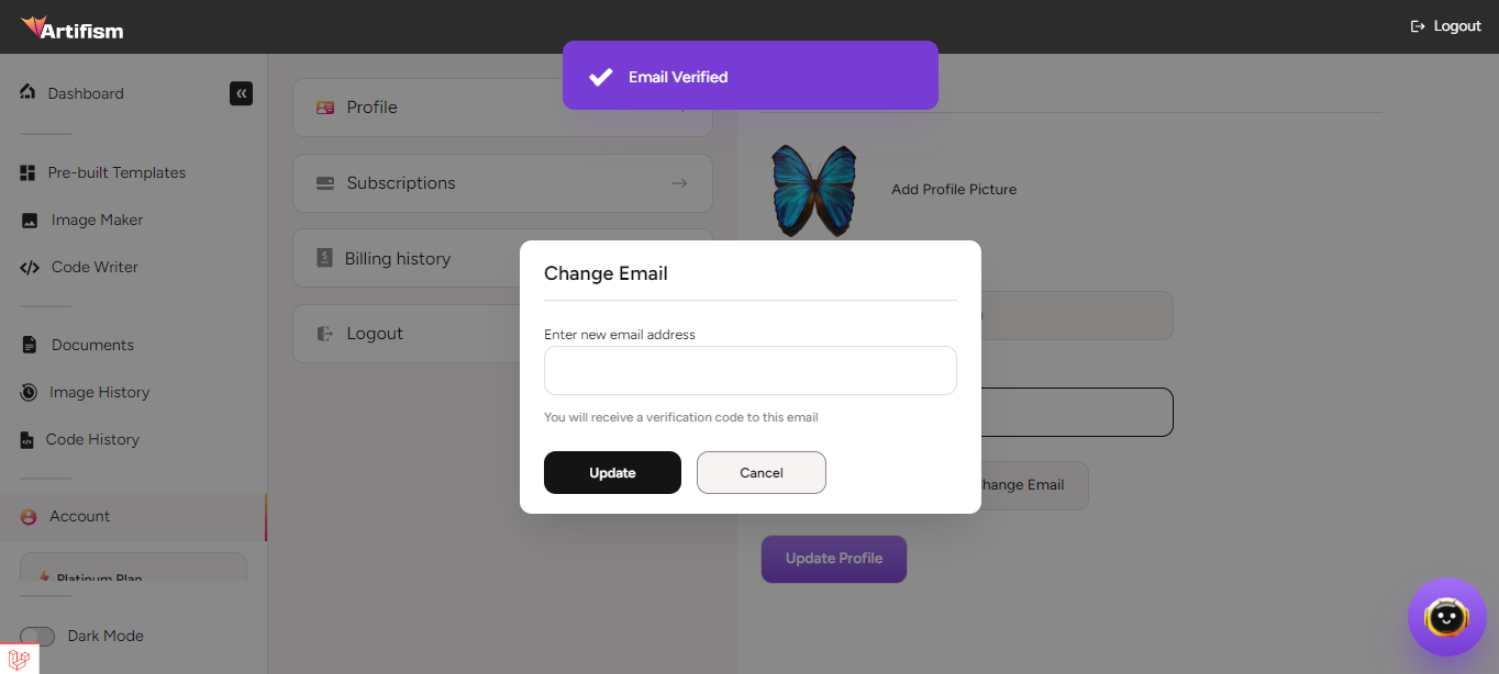 Now, the user has to provide the new valid email address and click on the Update button. After clicking on the update button, then the user sees a success message.