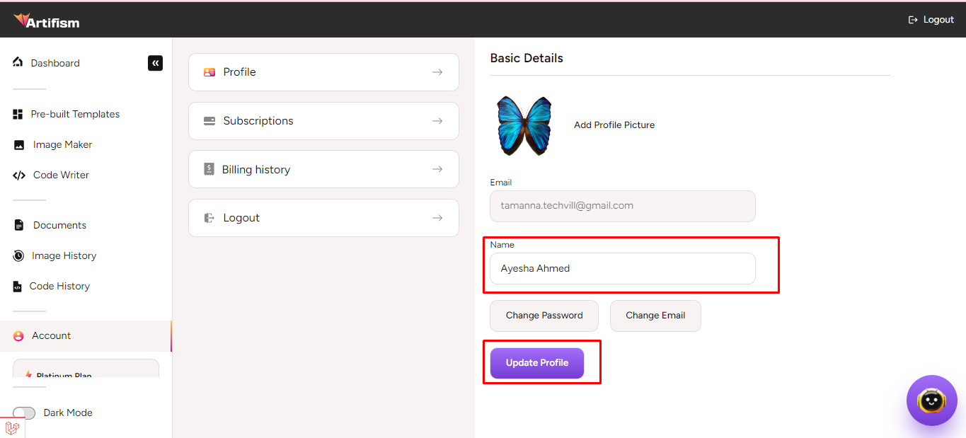 To change the username, write your wished name in the name section. After writing the name, click on the update profile button.